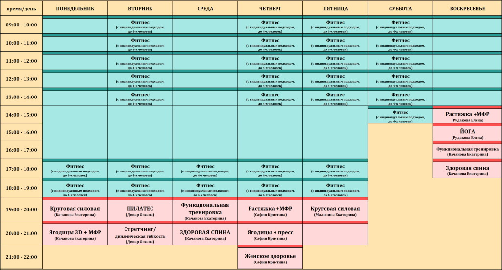 - групповые занятия (в мини-группах до 7-ми человек) функциональные силовые тренировки, ABS/CORE, Tabata, ягодицы + пресс, растяжка, шпагат, танцы (танцевальный фитнес, стрип пластика, lady mix)